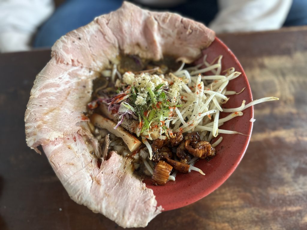 うーみぃちゃんと筆者が今回注文したのはメニューには載ってないけど、限定メニューの背油と生姜のワンタン麺と通常メニューのホルモンブラックのレアチャーシュー。