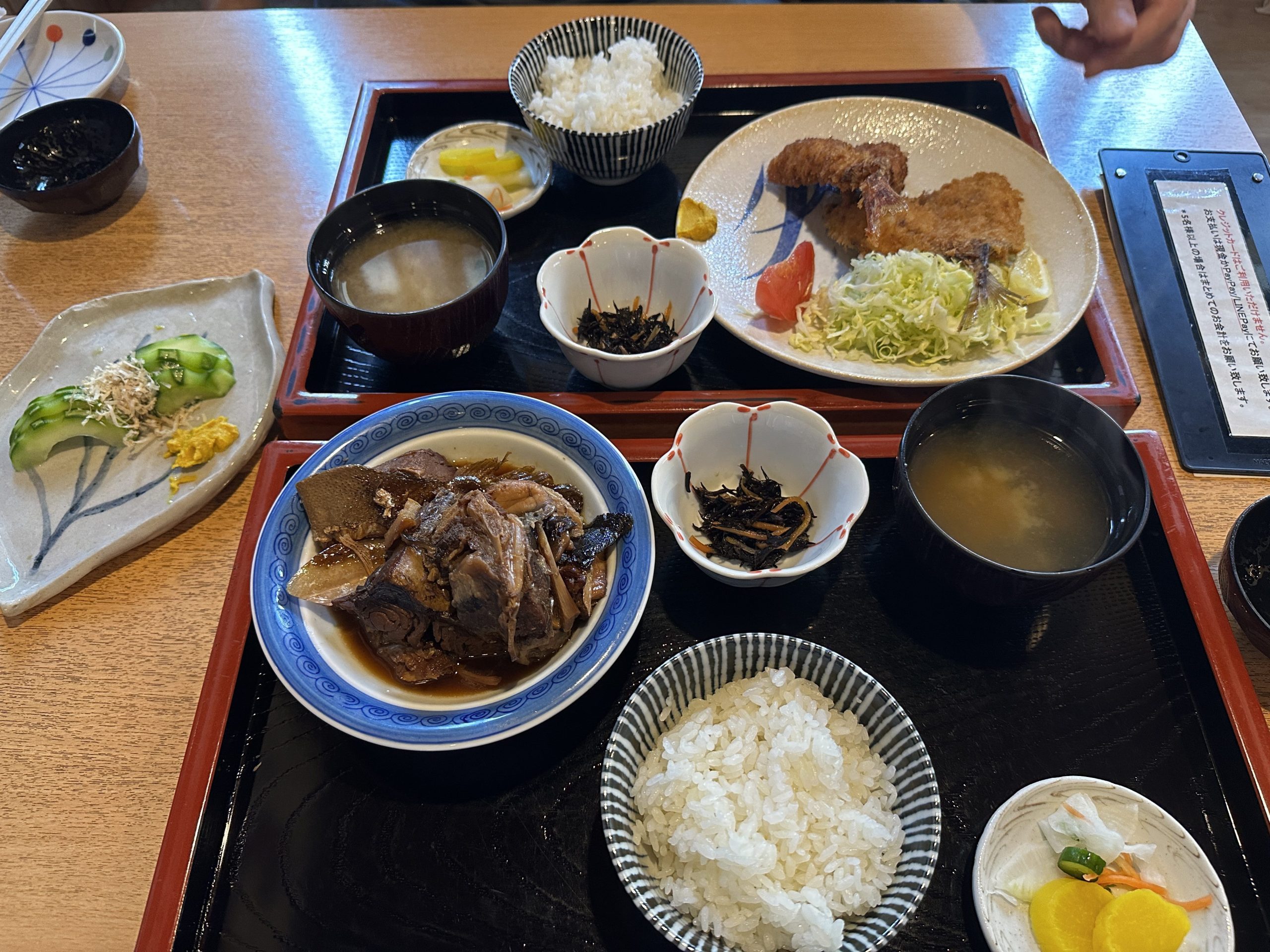 うーみぃちゃんと筆者が今回注文したのはかんぱちのアラ煮定食と、ホウボウフライとアジフライの定食、とメロンのお漬物。