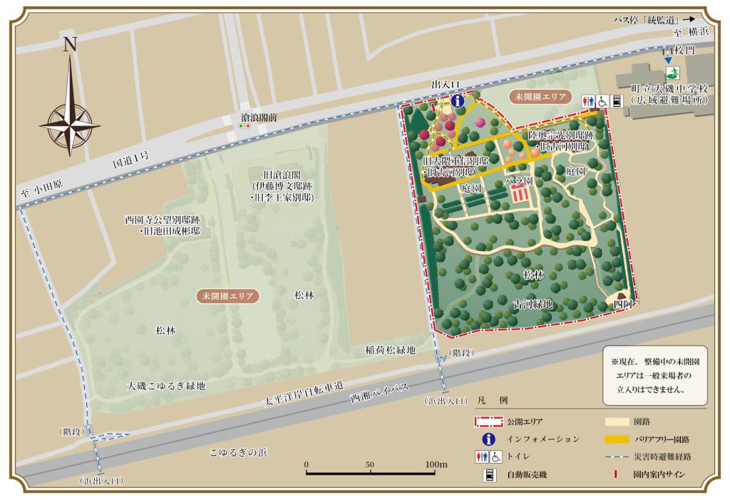 例えば、旧滄浪閣(伊藤博文邸跡)や西園寺公望別邸跡などが未公開エリアに含まれており、これらの建物は公開に向けて準備が進められている。