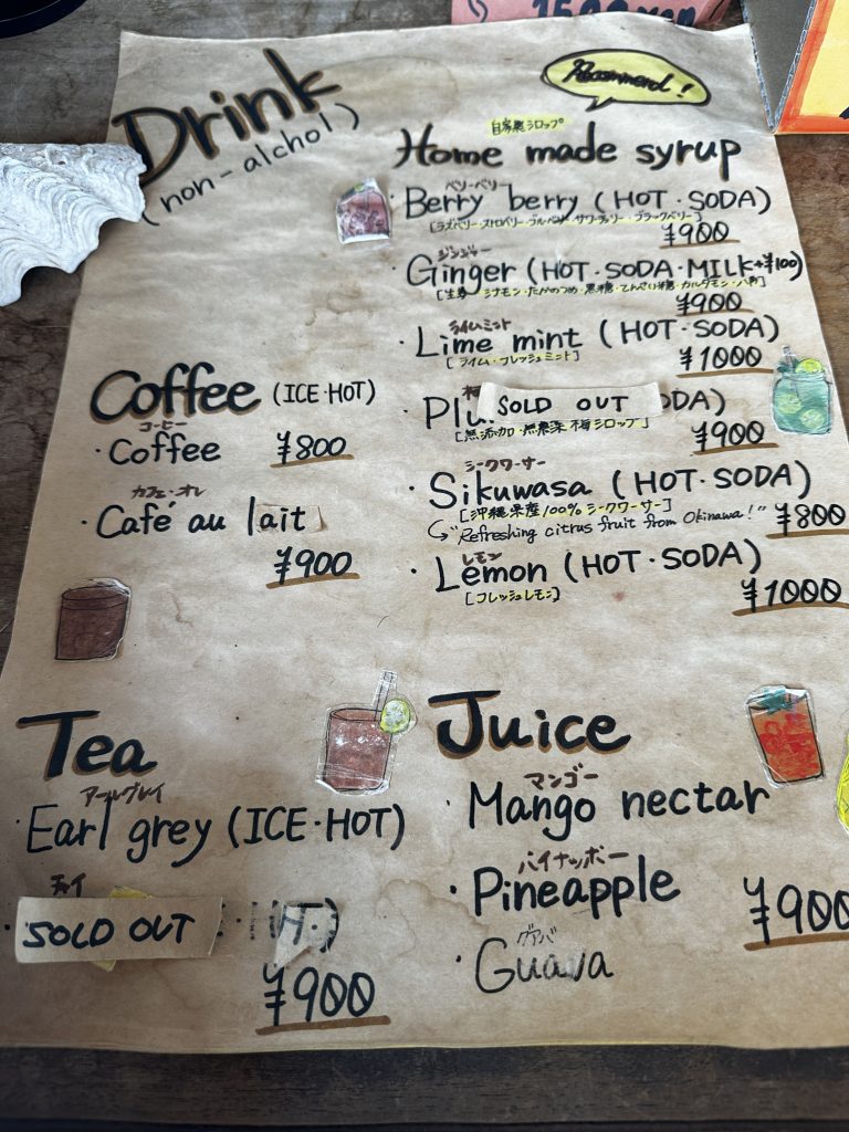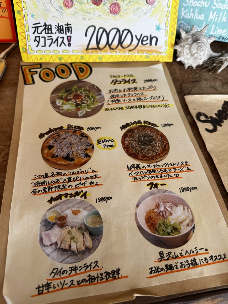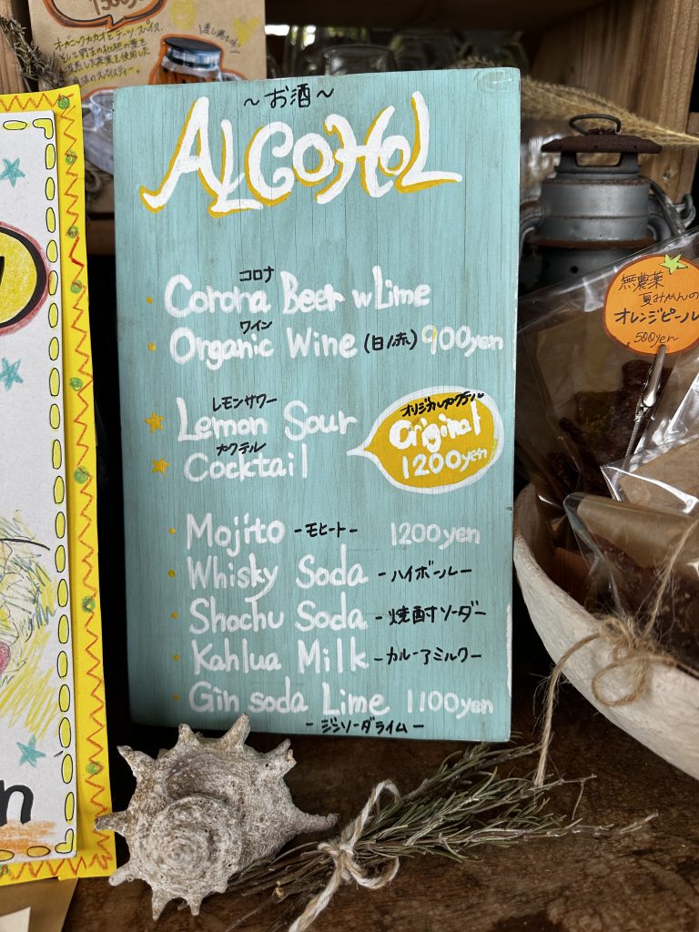 メニューにはカフェメニューだけでなく、アルコールや、地魚や地野菜を使った料理、ワインとおつまみを楽しめるメニューが揃っています。