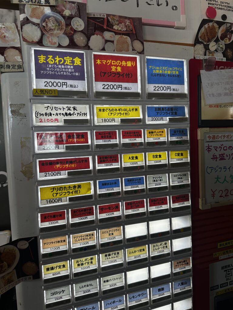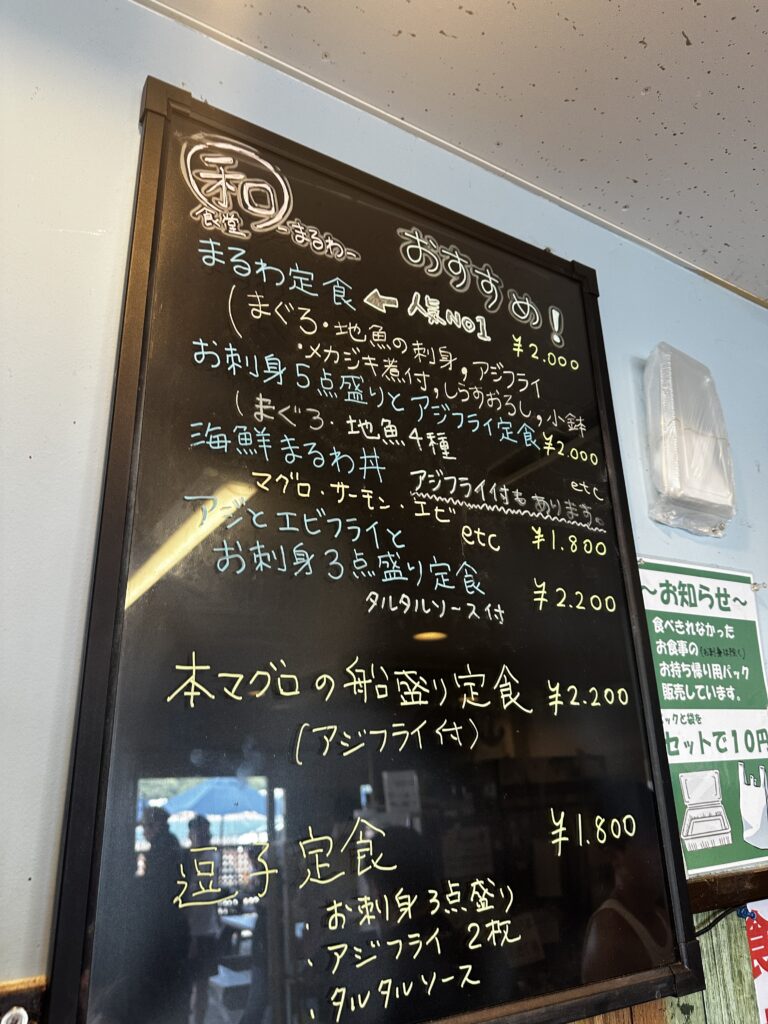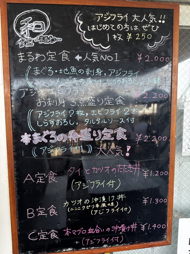 人気メニューはまるわ定食、アジとエビフライとお刺身3点盛り定食、まぐろの舟盛り定食、日替わりA〜C定食等々。