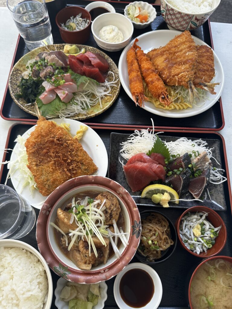 うーみぃちゃんと筆者が今回注文したのは人気No1のまるわ定食と、アジとエビフライとお刺身3点盛り定食。
