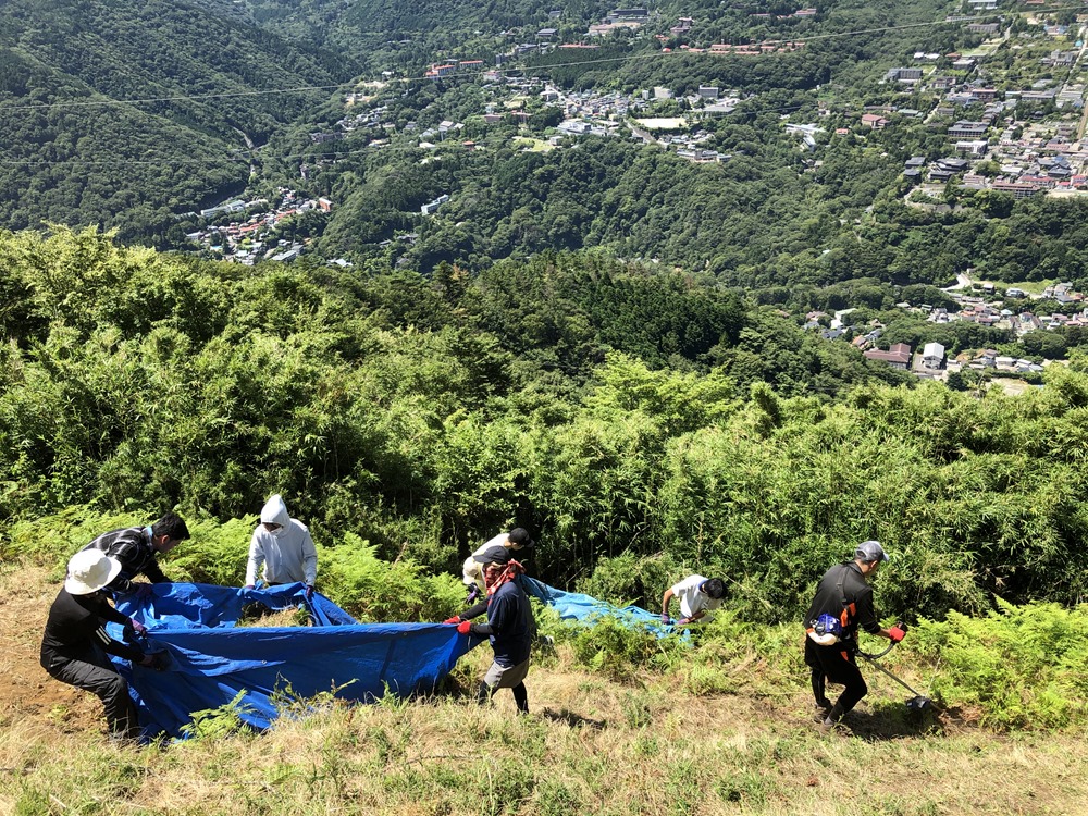 2ヶ月も前から炎天下の中、刈取り、乾燥の作業が繰り返され、乾燥した篠竹(箱根女竹長さ3m 程)を直径30cm程の束として250束作られることで、「大」の字が大きく描かれます♫