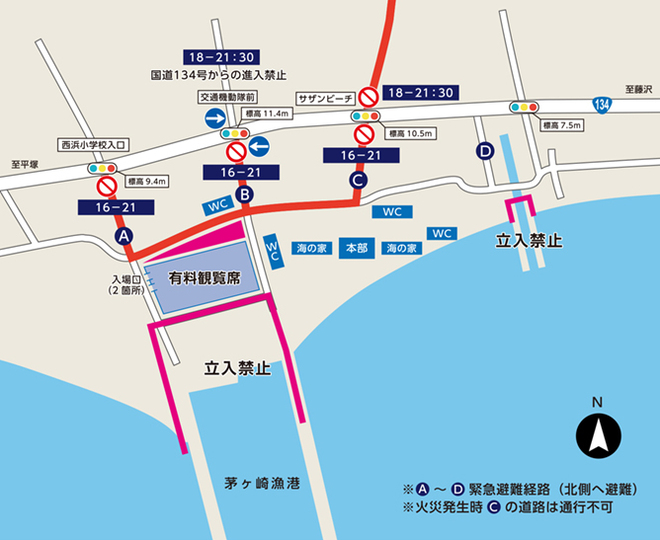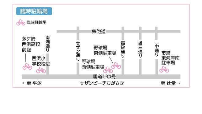 ※大会終了後、国道134号会場付近では歩行者横断のため一時規制が行われるとのこと。※自転車は国道134号から南側には渡ることができません。臨時駐輪場をご利用ください。