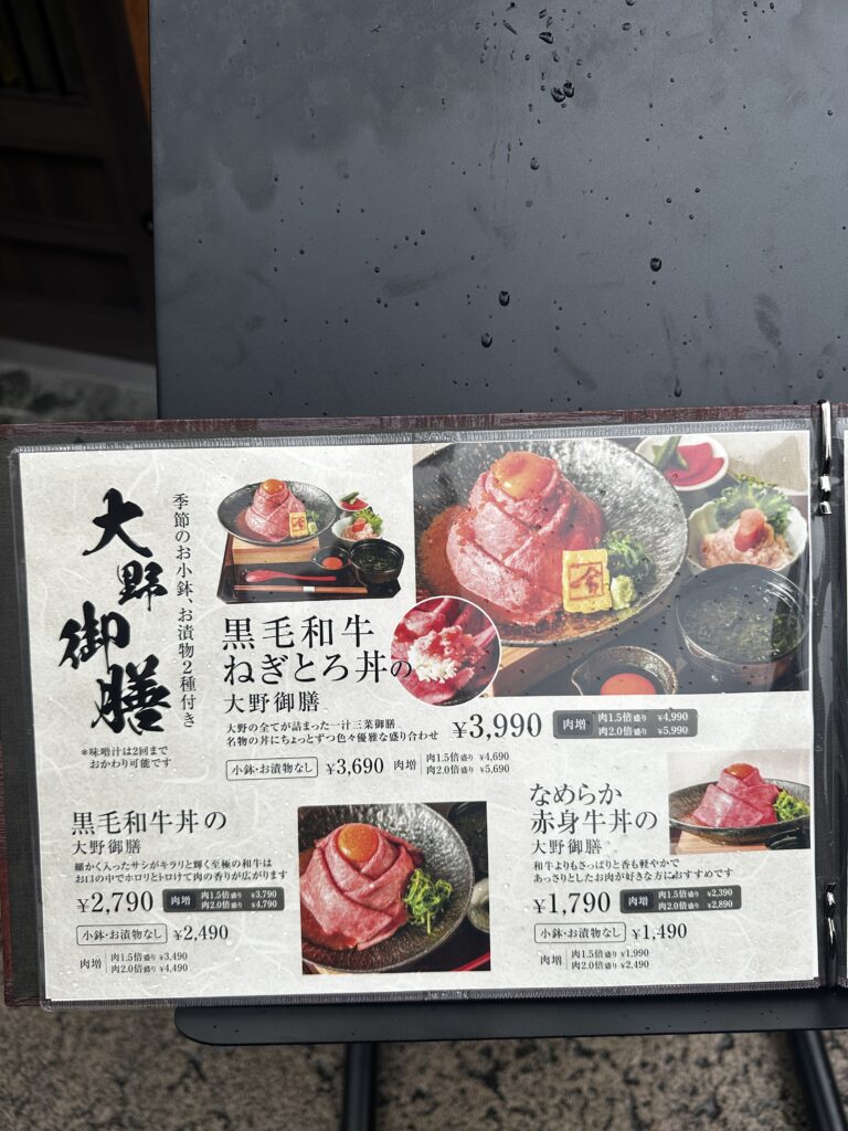 黒毛和牛ねぎとろ丼の大野御膳、黒毛和牛丼の大野御膳、なめらか赤身牛丼の大野御膳。