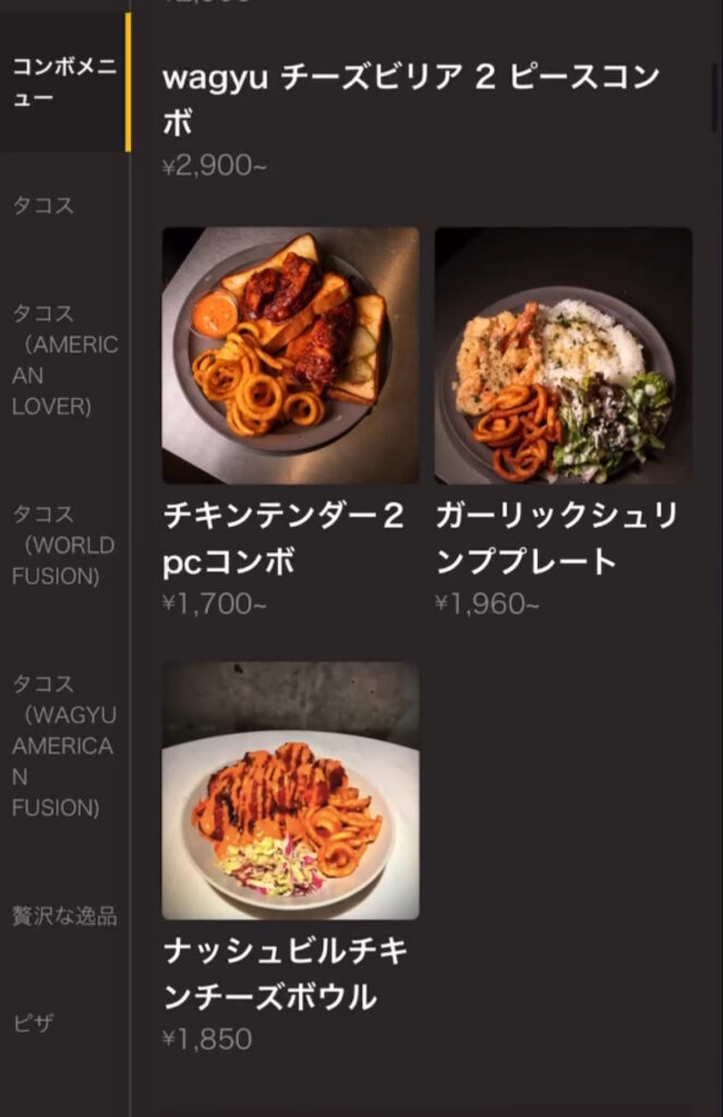 衣がザクザクしたフィッシュタコス、ヴィーガンタコス、選べるタコス2種+カーリーポテトが付くコンボもおすすめ。