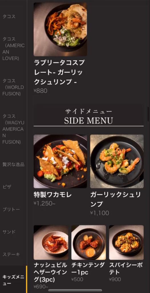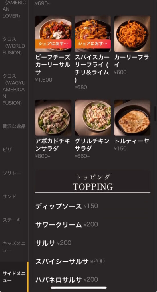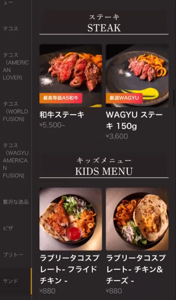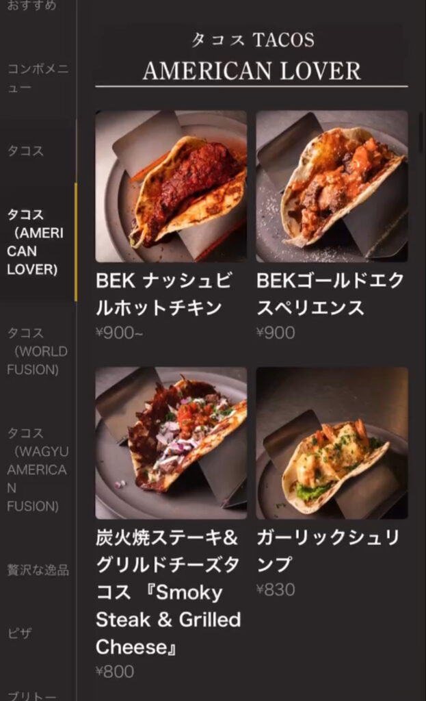 「ステーキタコス」や「ガーリックシュリンプ」「サワークリームアボカドシュリンプ」など、肉や海老を使った人気メニューが目白押し。