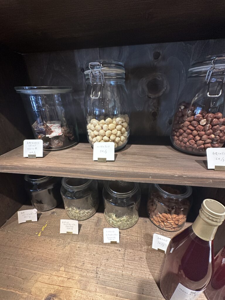 カフェスペースの端っこではスパイス系や、ナッツ類、茶葉の量り売りに、身体によさそうなドリンク系もありました。