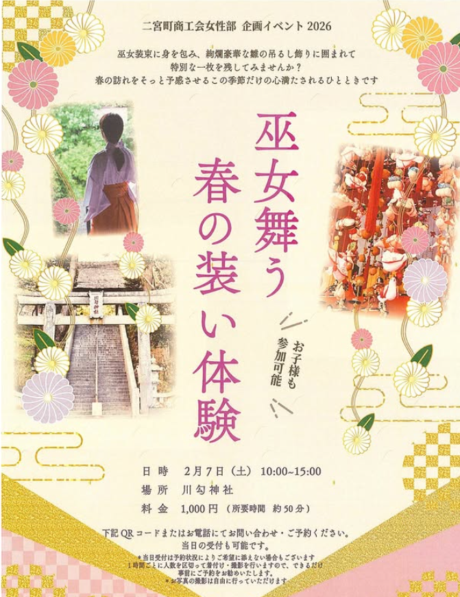 2026年2月7日(金)、神奈川県二宮町の川勾神社(かわわじんじゃ)にて、「巫女舞う春の装い体験」が開催されます。