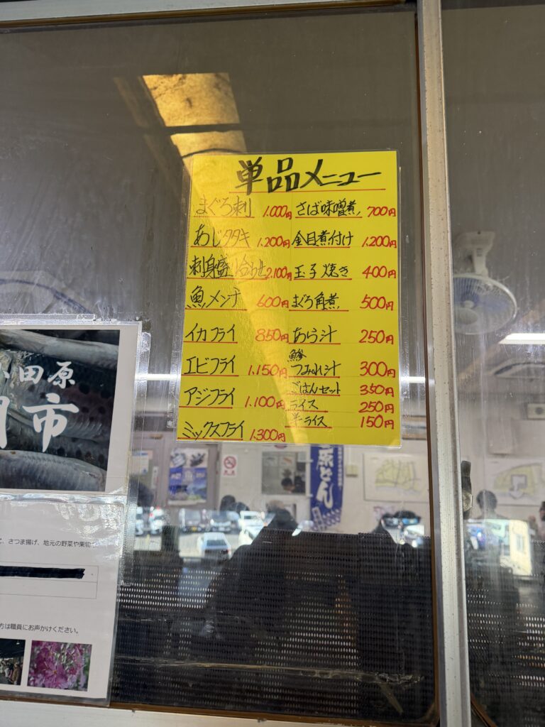 小田原漁港内の魚市場2階にある「魚市場食堂」は、相模湾で水揚げされた新鮮な魚介を手頃な価格で楽しめる、地元民にも観光客にも愛される人気店です。
